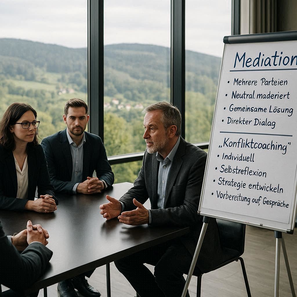 Der entscheidende Unterschied zwischen beiden Verfahren liegt in der Anwesenheit und Interaktion der Konfliktparteien. In der Mediation begegnen sich die Parteien direkt, wodurch Verständigung und gemeinsame Lösungen möglich werden. Im Konfliktcoaching hingegen erfolgt die Bearbeitung einseitig – die betroffene Person reflektiert und verändert ihr Verhalten, um Konflikte künftig anders zu gestalten (Berning & Krabbe, 2020, S. 109).