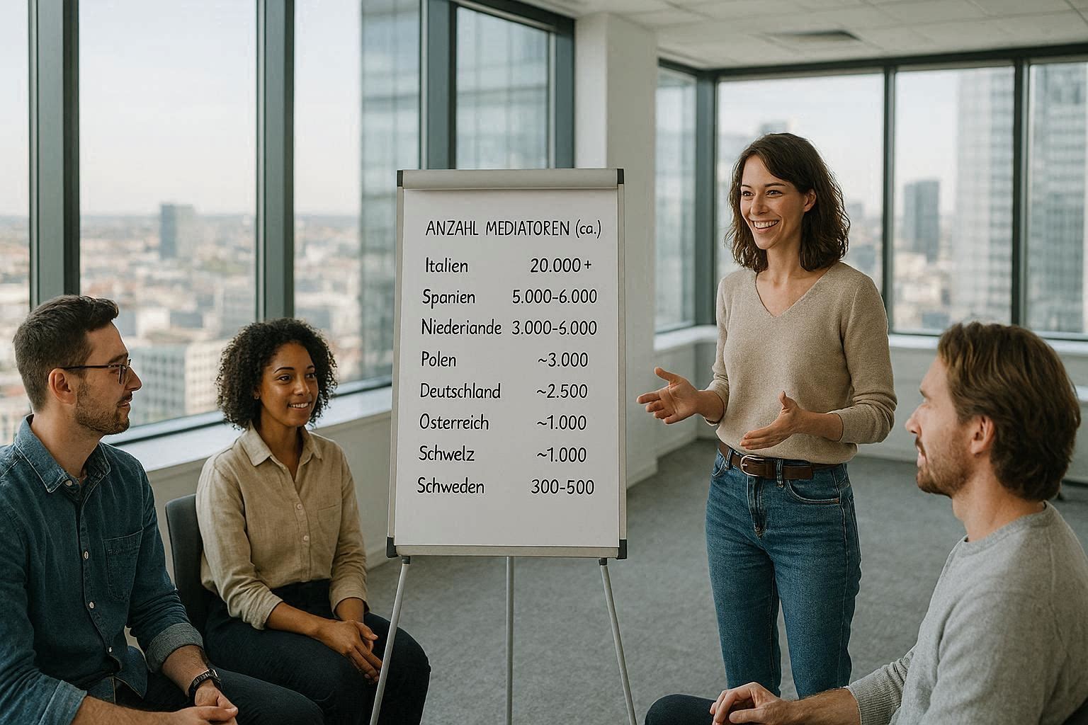 Im europäischen Vergleich besitzt Deutschland mit seiner wachsenden Zahl ausgebildeter Mediatoren eine mittlere Position. Länder wie die Niederlande und die Schweiz punkten mit 20.000 bzw. 20.000 Mediatoren, einem hohen Anteil aktiver Fachkräfte (60–70%) und einer breiten institutionellen Verankerung der Mediation, insbesondere in gerichtlichen und wirtschaftlichen Kontexten (Trenczek & Mattioli, 2015; Schmid & Müller, 2024). Österreichs 12.000 Mediatoren arbeiten eher in Familien- und Wirtschaftsmediation bei ähnlicher Aktivitätsquote (Dachs, 2022).